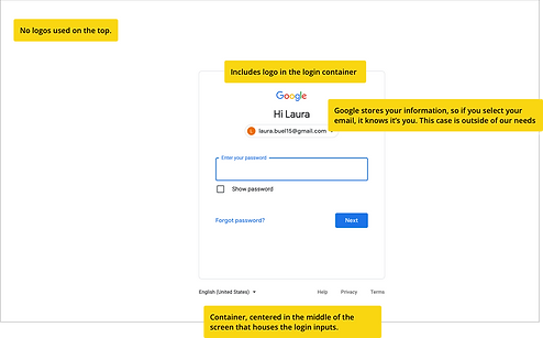 Below are the internal and external login page examples shared by the marketing team. In the first example, I included annotations on necessary changes to make these ADA-compliant. The second example shows minimal rearrangements to the layout based on UX best practices.